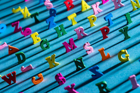 Multicolored letters on a blue background. Top view.