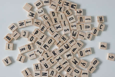 Many wooden cubes with letters on red background