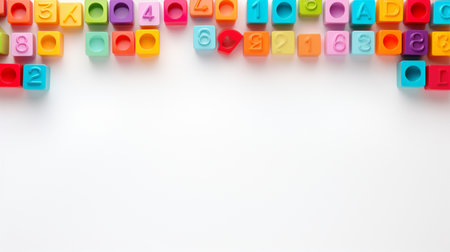 Colorful plastic bricks for kid, toddler, education and learning, toy shop, flat lay, copy space on white background.