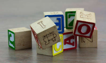 Wooden toy cubes with letters on the table. Shallow depth of field