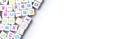 Lots of colorful decorative cubes with letters on white background. The concept of studying or writing. The place under the inscription.