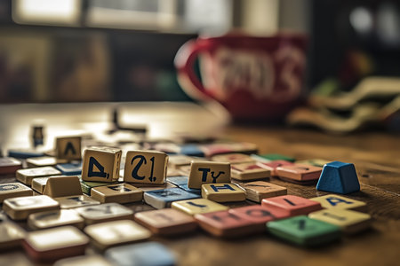 This image was generated with AI. The photo features a pile of classic wooden Scrabble tiles scattered on a polished marble table. The smooth texture of the marble contrasts with the natural grain of the wooden tiles, evoking a sense of nostalgia and creativity. Perfect for celebrating National Scrabble Day or projects related to word games, education, and leisure.
