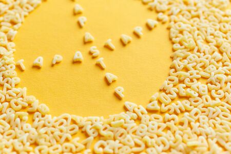 Top view of the macaroni alphabet and the inscription in a circle, on a bright yellow background.