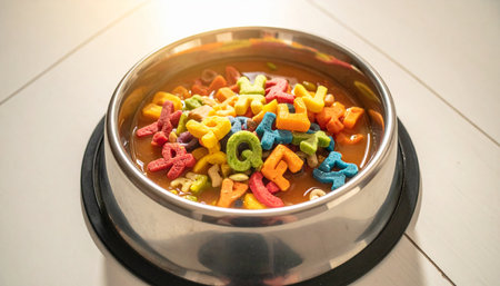 A shiny metal pet bowl is filled with a whimsical alphabet soup. Colorful letters float in the broth, suggesting concepts of learning, intellectual nourishment, and the playful side of education.