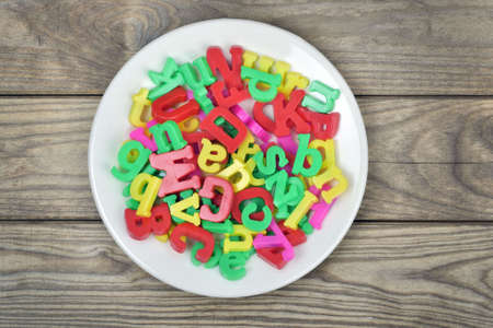 multicolored wooden letters in a plate, eating knowledge, English letters dyeing in different colors