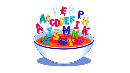 Illustration of a bowl of soup with letters and animals on a white background