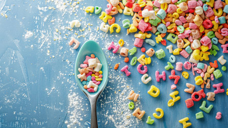 Colorful cereal letters and shapes on spoon table