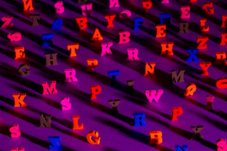 The letters of the Latin alphabet are illuminated from the upper corner. Latin letters in any order. Latin letters stand on a lilac background. Bright background with the English alphabet.