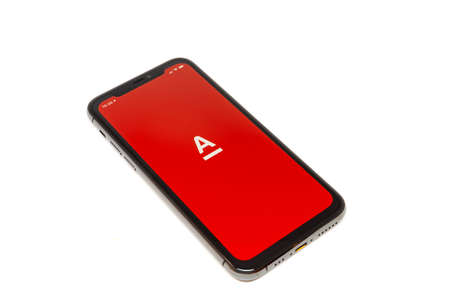 Moscow / Russia - January 19, 2020: Black iPhone 11 Pro lies on a white background. Alfa Bank app on screen