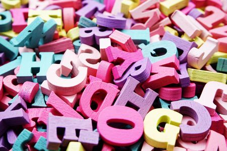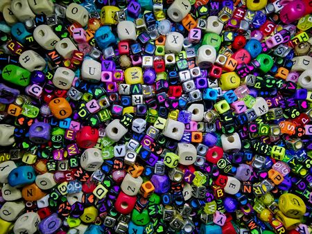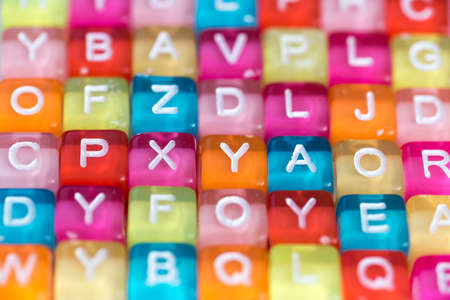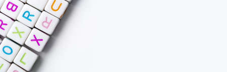 Lots of colorful decorative cubes with letters on white background. The concept of studying or writing. The place under the inscription.