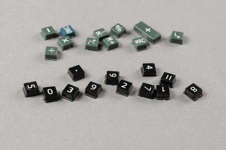 Broken and disassembled calculator buttons on gray background. Small buttons with numbers, mathematical signs. Plastic waste.