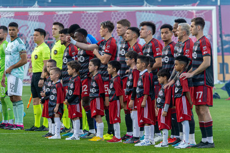 Toronto, ON, Canada - April 15: Toronto FC players on the field before the 2023 MLS Regular Season match between Toronto FC (Canada) and Atlanta United (USA) at BMO Field in Toronto, Canada (Score 2:2)