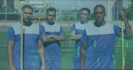 Image of statistics over rugby players. Medical research technology and sport concept digitally generated image.
