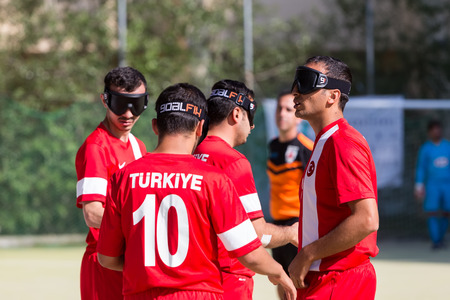Thessaloniki, Greece - May 7, 2016: Undefined players in action during of 2nd IBSA Euro Challenge Cup and Thessaloniki International Blind Football Tournament between the teams Bordeaux vs Turkey