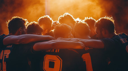American football coach briefing players in a locker room, outlining strategy and tactics while team listens intently, focused and preparing for the upcoming game