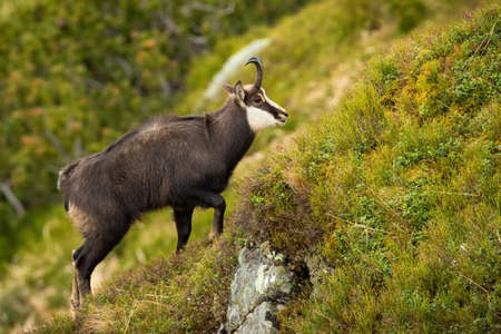 Tatra chamois, rupicapra rupicapra tatrica, climbing steep slope in mountains in summer nature. Wild goat walking on rocks in green environment. Horned brown animal going up on hills.