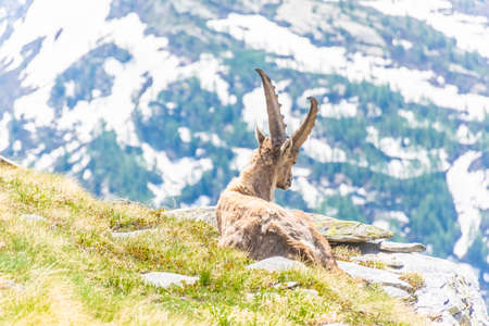 Ibex on the background of the Mont Blanc massif. Alps.