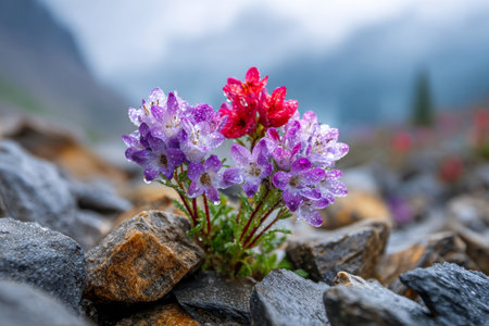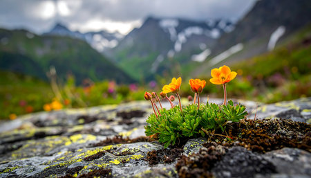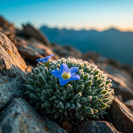 A rare alpine flower blooming on a rocky mountainside.