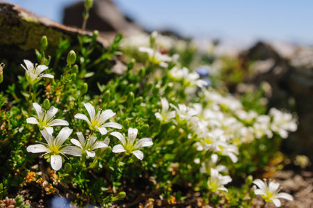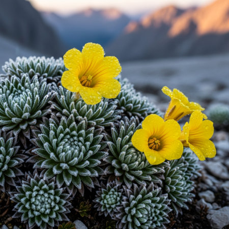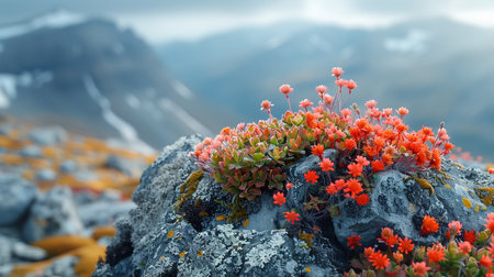 Close-up of delicate alpine wildflowers and succulents growing on a rock, with blurred mountains in the distance. Natural landscape.