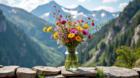 Vibrant wildflower bouquet in jar with majestic mountain landscape background. That the image is generated using AI.