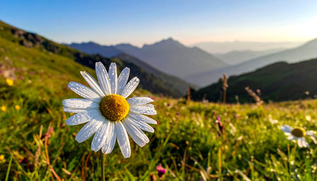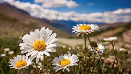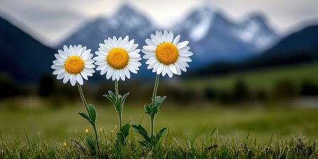A serene view of three bright daisies standing proudly in a lush meadow with majestic mountains in the background, creating a tranquil atmosphere perfect for nature lovers.