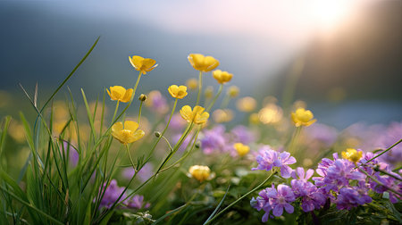 A stunning view of a colorful meadow filled with delicate yellow buttercup flowers and vibrant purple blossoms, illuminated by soft morning light, creating a serene atmosphere.