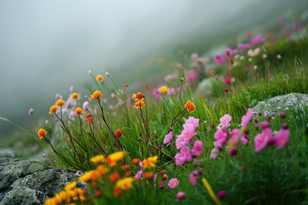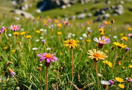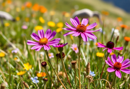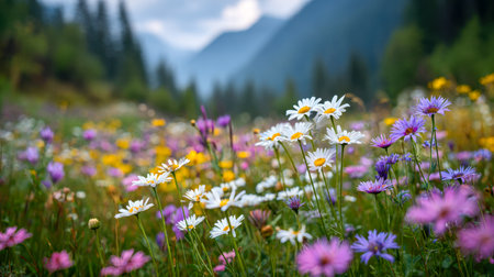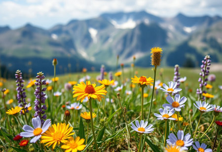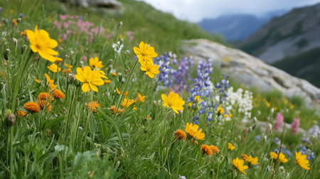 Bright wildflowers bloom in a lush mountain meadow during the summer, showcasing vibrant colors and serene natural beauty