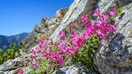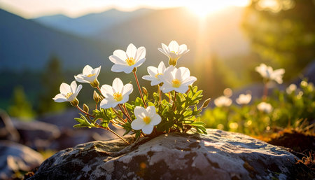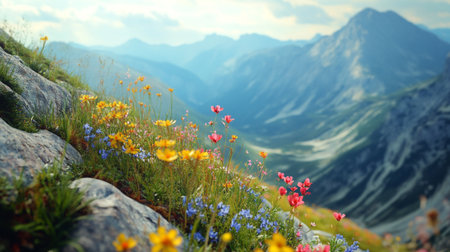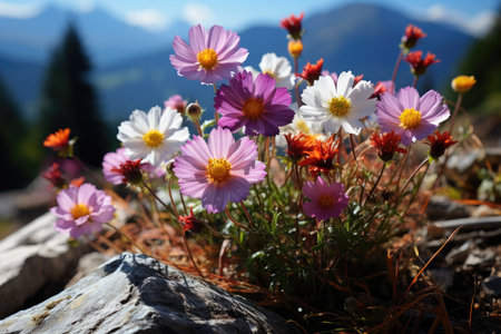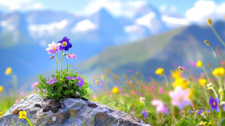 A breathtaking view of vibrant wildflowers blooming atop a rocky outcrop, framed by a majestic mountain backdrop. The scene captures the essence of nature's beauty, showcasing colorful petals against a soft-focus landscape.