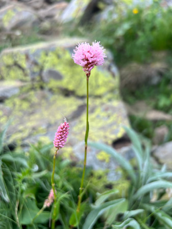 Colorful flowers in the mountains. Alpine meadow with pink flowers.