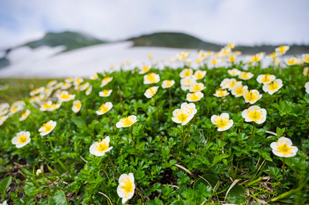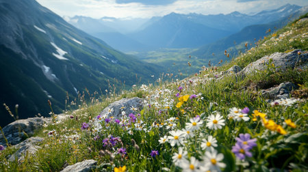beautiful alpine meadow with blooming flowers and mountains in background