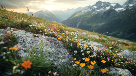 Vibrant Wildflowers in Alpine Sunset
