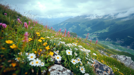 Mountains Flowers Meadow Colorful daisies field in Alps green valley