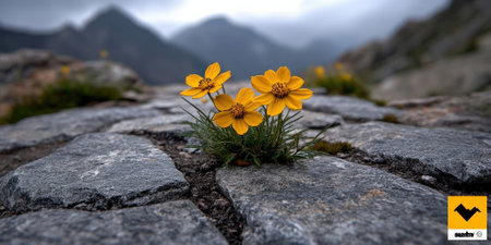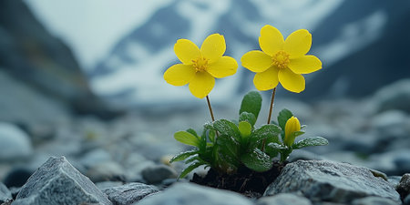 Stunning bright yellow flowers emerge from rocky terrain, showcasing nature's resilience amidst a serene mountain backdrop. Ideal for nature enthusiasts.