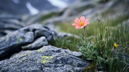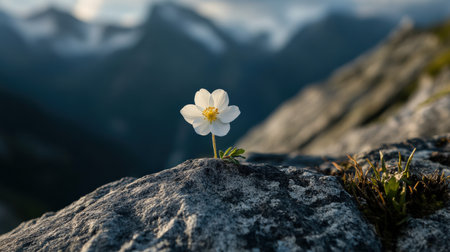 A lone flower blooming on a rocky mountain, representing strength in uniqueness
