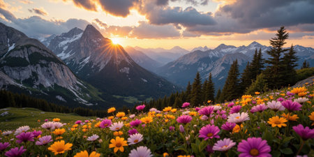 Colorful wildflowers flourish in a sun-drenched meadow, creating a peaceful atmosphere. Majestic mountains rise in the distance, illuminating the beauty of nature in full bloom.