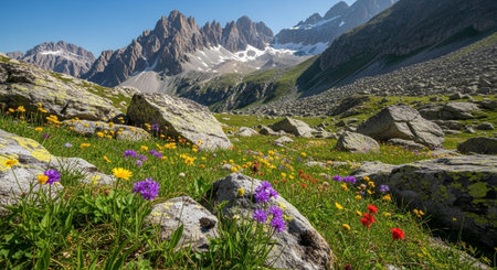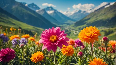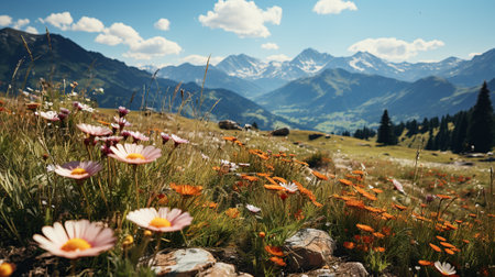 Scenic Alpine view with blooming meadows and snow-capped peaks. Copy space available for branding