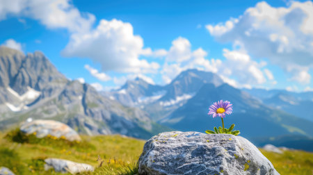 A stunning purple daisy flower leans gracefully on a rock, set against a breathtaking mountain landscape under a vibrant blue sky filled with fluffy clouds.
