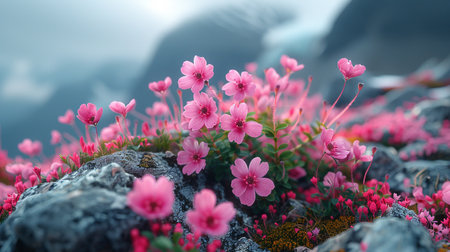 Close-up view of vibrant pink arctic wildflowers growing amongst grey rocks, with blurred mountains in the background.
