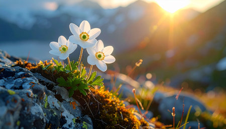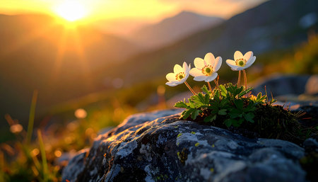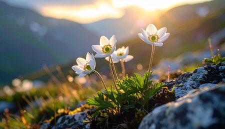 Beautiful white anemone flowers blooming in mountains at sunset