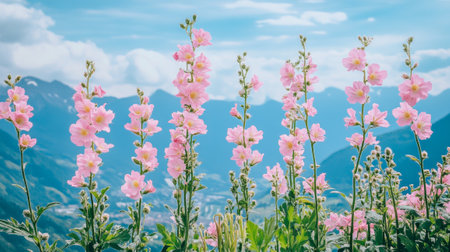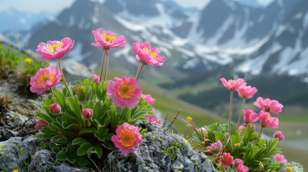 Beautiful pink flowers blooming in a mountainous landscape, with snow-capped peaks in the background and lush greenery