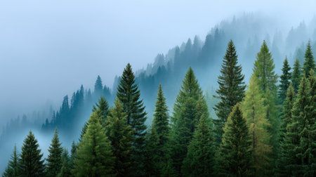 This atmospheric image depicts a misty forest with evergreen trees shrouded in fog, creating a tranquil and serene environment that showcases nature's untamed beauty.