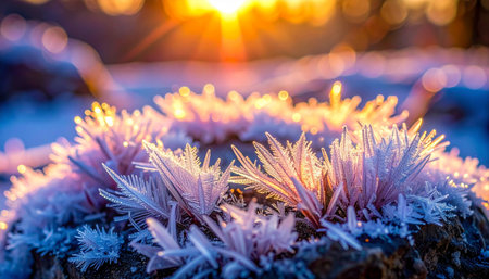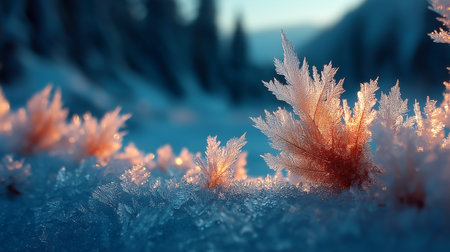 Intricate frost crystals glow in warm sunlight, their delicate patterns glistening against a cool backdrop. The scene captures the beauty of winter in exquisite detail