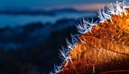 As the sun dips below the distant mountain peaks, its last warm rays catch the edges of delicate ice crystals.