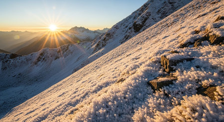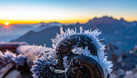 As the first light of dawn crests over distant mountain peaks, it illuminates the delicate, sharp crystals of hoarfrost that have formed overnight.
