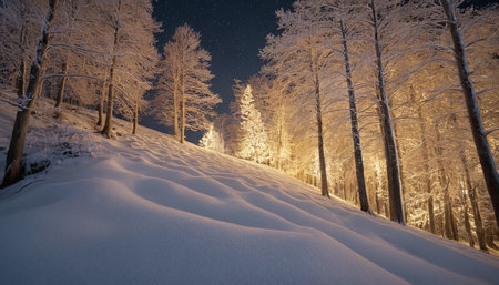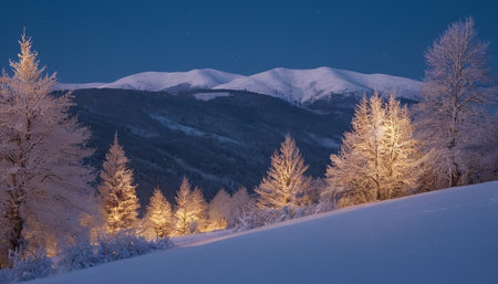 Soft outoffocus lights le amidst a sea of crisp white snow resembling the ling buds of frostkissed flowers on a chilly winter day.