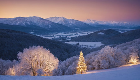 Winter landscape with snow covered trees and mountains in the background at sunset