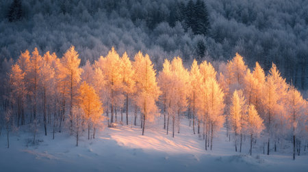 A serene winter landscape featuring frosted trees under soft sunlight, creating a tranquil atmosphere perfect for holiday season designs, with ample copy space for text or graphics
