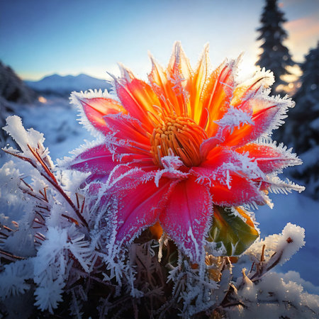 AI generated image showing a frozen bright flower head in frosty winter ambiance