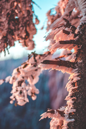 Beautiful frost crystals sparkle in the winter light, creating a magical icy scene