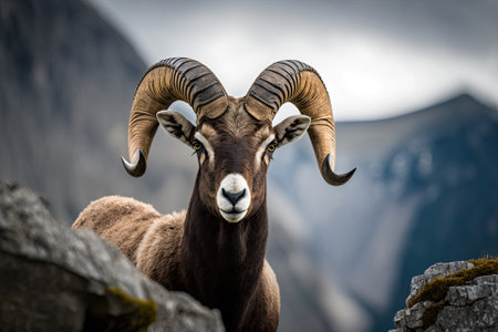 Mouflon standing on the top of a rock in the mountains